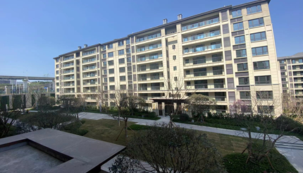 项目总建筑面积约 83965 平方米,由 8 层的洋房 22 栋,7 层的洋房 1 栋组成,最大建筑高度为 24m,洋房建筑面积约为 66908 平方米;场地内高差较大,采用分台设计,地下车库接合地形设计,分高区,中区,低区三区,各分区之间可通过车道及竖向楼梯连接。车库面积约 16459.平方米,建成后与一期车库连接成一个整体。